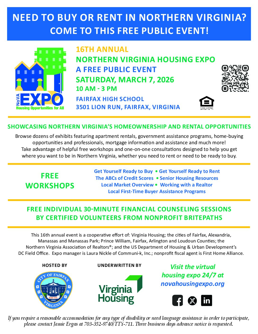 Browse dozens of exhibits featuring apartment rentals, government assistance programs, home-buying opportunities and professionals, mortgage information and assistance and much more! Take advantage of helpful free workshops and one-on-one consultations designed to help you get where you want to be in Northern Virginia, whether you need to rent or need to be ready to buy.