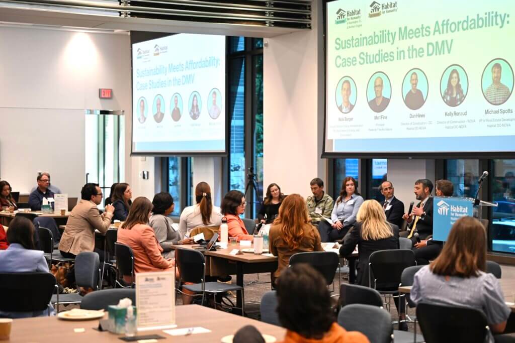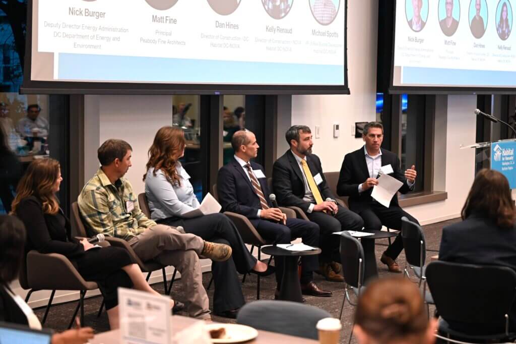 Featuring Teresa Hamm Modley, VMDO Architects, Giuls Kunkel, BGO, Oscar Macció, Hamel Builders, and moderated by Nick Burger, DC Department of Energy and Environment, panelists shared what inspired their work and their partnership with Habitat DC-NOVA. These building industry experts shared lessons learned from their early days and discussed how to scale sustainable practices for impact in affordable housing. Panelists wrapped up by exploring the future of sustainable building in housing.